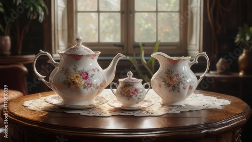Floral tea set on antique table