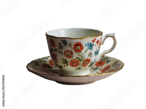 Floral teacup and saucer set with gold trim on a dark background view