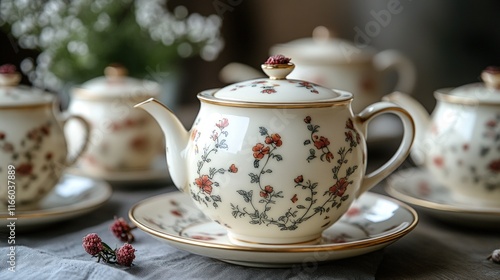 Floral teapot and matching teacups.