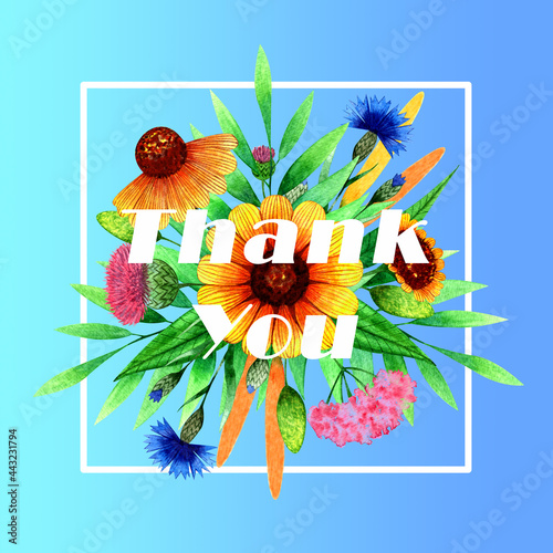 Floral Thank you card with beautiful realistic wild flowers and plants composition