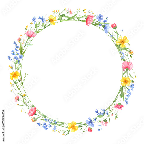 Floral wreath circle frame with colorful wildflowers. Perfect for wedding invitations, spring decorations, and summer designs.