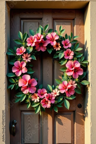 Floral wreath on a worn out wooden door frame, floral wreaths, bohemian home decor
