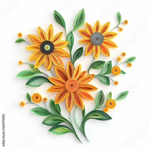 Flower and nature paper quilling concept. Colorful quilled flowers with green leaves create a vibrant floral design.