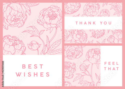 Flower cards set. Japanese peony blossoms, natural backgrounds. Gentle gorgeous Japan blooms, botanical garden postcards collection. Gorgeous floral designs. Hand-drawn graphic vector illustration