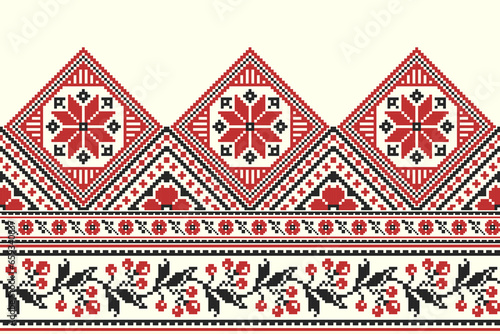 flower embroidery on cream background. ikat and cross stitch geometric seamless pattern ethnic oriental traditional. Aztec style illustration design for carpet, wallpaper, clothing, wrapping, batik.
