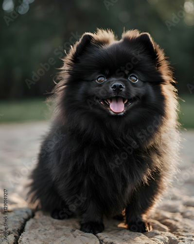 Fluffy Black Pomeranian with a Happy Smile: A tiny black Pomeranian dog with a thick, fluffy coat and a bright, happy smile.