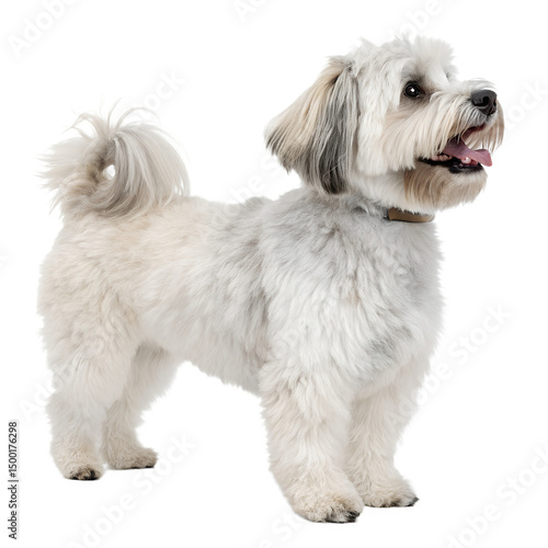 Fluffy Companion's Pawsome Pose: A charming, small dog, with a light-colored fluffy coat, stands proud. Its joyful expression and attentive gaze, combined with a relaxed posture.