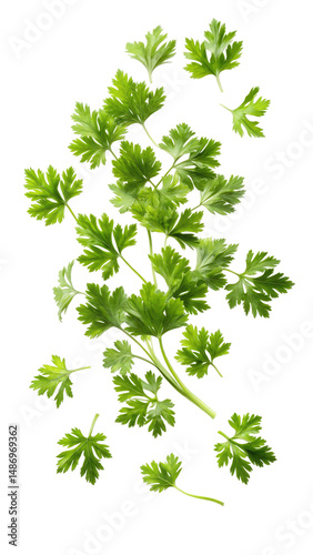 Flying Fresh Green Parsley Leaves with Natural Texture and Herbal Aroma isolated on transparent white background, clipping path
