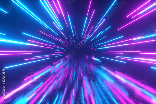 Flying in space with luminous neon lines. Hyperspace. Modern ultraviolet spectrum of light. Blue purple color. 3d illustration
