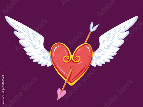 Flying lovely heart with two white wings and pierced arrow vector illustration isolated on horizontal background. Simple flat cartoon art styled valentines day themed drawing for card decor prints.