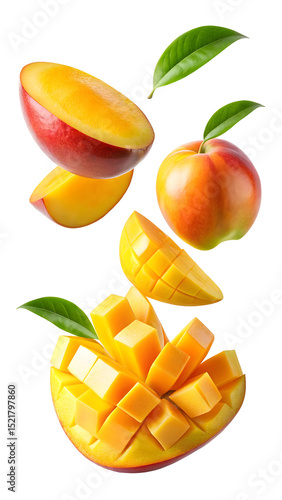 "Flying Mango Fruit Slices on White Background – Fresh Tropical Fruit and Food Splash Concept"