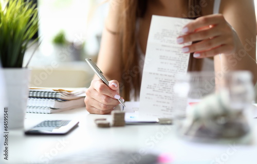 Focus on smart businesswoman sitting indoors and counting presumable profits from charts in important paper tablet with numbers. Lady making notes. Office concept. Blurred background