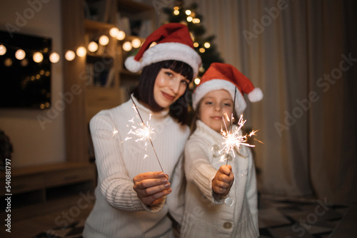 Focus on sparklers, blurred happy mother and little cute daughter holding bengal lights in their hands on background of decorated christmas tree at home.