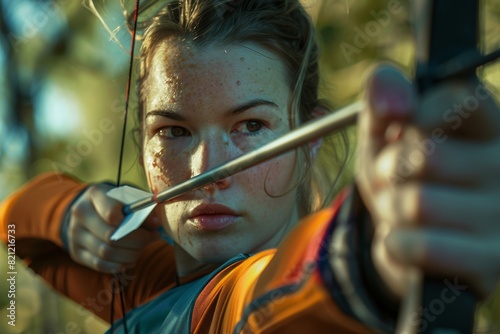 Focused archer aiming arrow with intensity and precision in an outdoor setting