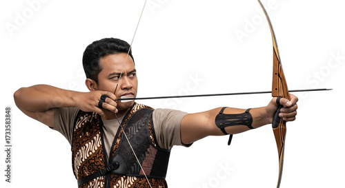Focused Asian archer in a traditional batik vest aiming a wooden recurve bow with intense concentration.