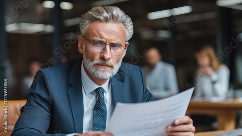focused doubtful mature businessman reading contract document thinking considering risks with professional lawyers legal experts executive team analyzing financial report sitting at office table no l