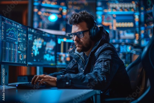 Focused hacker working on computer in dark room.