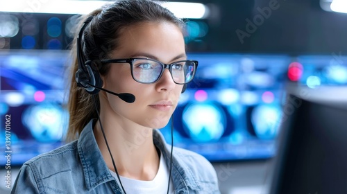 Focused IT Specialist Monitoring System - A concentrated IT professional wearing a headset, meticulously monitors multiple screens displaying complex data, symbolizing technology, support