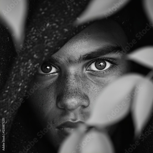 Focused Man Eyes Close Up Through Leaves, Natural Light