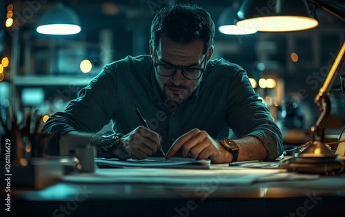 Focused man working late at a desk, surrounded by stationery in a warmly lit workspace