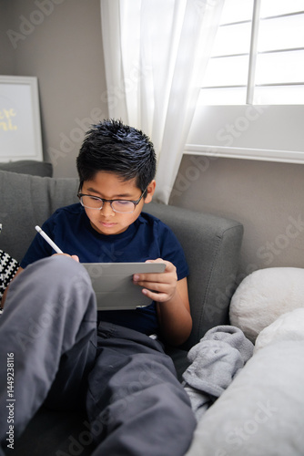 Focused Young Boy Drawing on Digital Tablet in Comfortable Setting