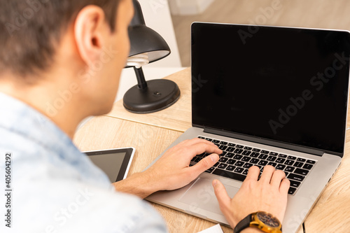 Focused young businessman holding video call with clients on laptop. Concentrated millennial man in glasses giving online educational class lecture, consulting customer.