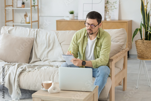 Focused young male teacher with laptop and notebook giving online lesson at home