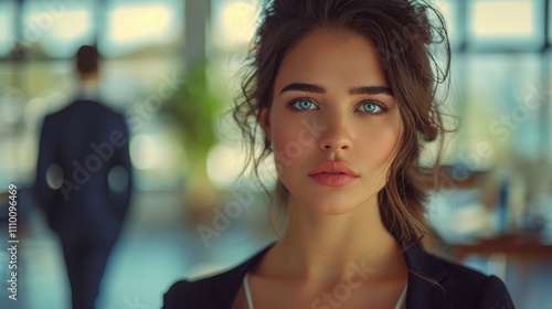 Focused Young Woman with Freckles and Partner in a Modern Office Setting