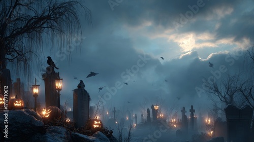 Foggy gothic cemetery at Halloween night with glowing jack-o'-lanterns on tombs, drifting fog, swaying willow branches, perched ravens, dim lantern light, full moon, cinematic dark fairytale