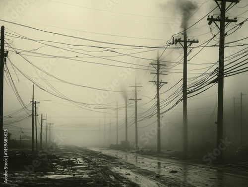 Foggy industrial street scene; power lines, poles, and a muddy road vanish into the mist