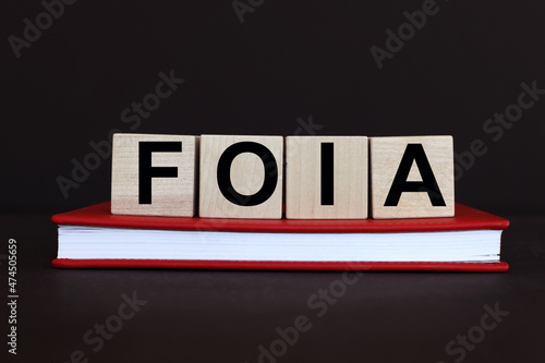 FOIA. text on wooden cubes. On a black background. red notepad.