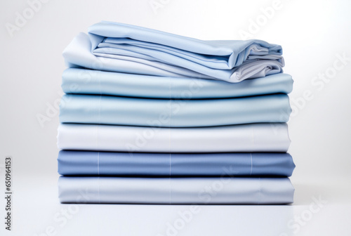 Folded clothes in stacks of various simple blue placed on a table on a light background
