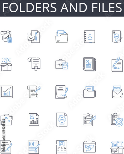 Folders and files line icons collection. Directories and documents, Containers and data, Archives and records, Binders and paperwork, Portfolios and sheets, Dossiers and files, Registers and folders