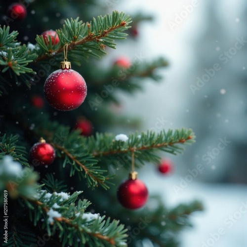 Foliage clad tree branch with red berries and ornaments amidst winter foliage, festive, winter wonderland