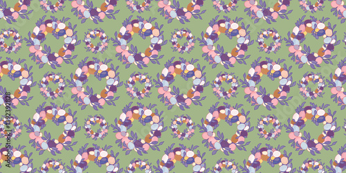 Foliage egg wreath illustration on green background. Easter religious catholic holiday wallpaper for banner design greetings.