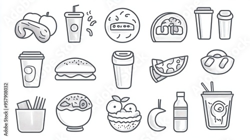 Food and Drink thin line icon set. Containing pizza slice, burger, hot dog, coffee cup, soda can, ice cream cone, apple, banana, sandwich, donut, salad bowl, sushi, taco.