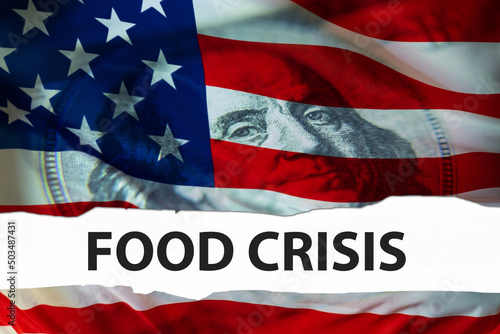 Food Crisis in USA. Concept of sharp increase in food prices. Rising cost of meal in stores. Words food crisis in front of flag of America. Portrait of Franklin on US money. Humanitarian crisis