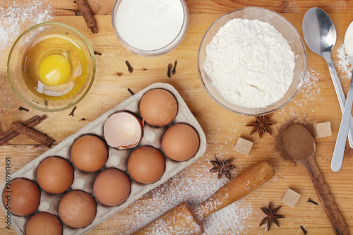 Food ingredients for baking: flour, eggs, milk, sugar