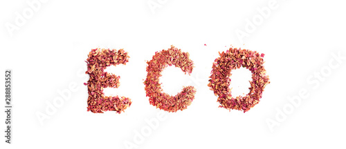 Food typography word Eco made of dried rose petals. Clean and healthy eating concept. Isolated on white background