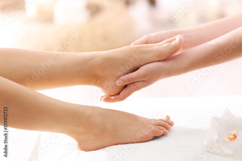 Foot massage in spa salon, closeup