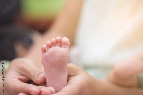 foot of the newborn in the hand of mother