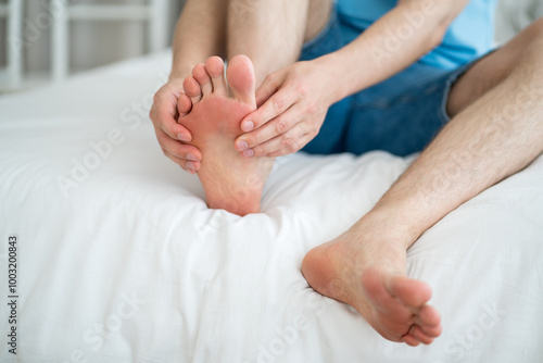 Foot pain, corns and calluses, dry skin on legs, man suffering from feet ache, podiatry concept