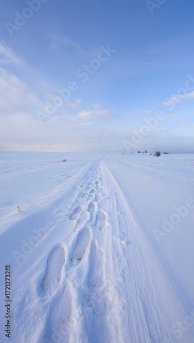 Footprints leading into the distance on a snow covered landscape under a bright sky