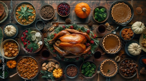 For Christmas, the Turkey sits on an elegant table topped with other dishes and vegetables, Christmas and Thanksgiving themes