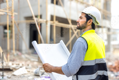 Foreman, engineer, or architect with safety helmet holding laptop and blueprints for inspection details on construction in a new real estate construction site with crane and mechanical equipments.