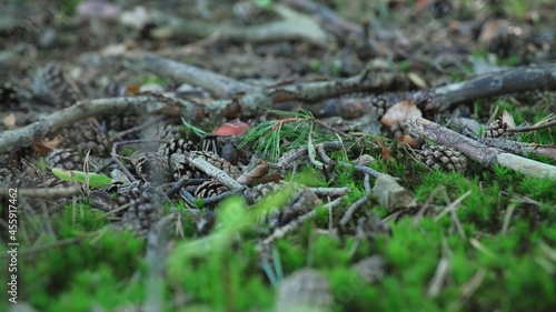 Forest Ground Foliage with Mushrooms Sticks Moss and Tree Cones