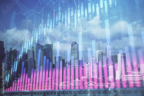 Forex chart on cityscape with skyscrapers wallpaper multi exposure. Financial research concept.