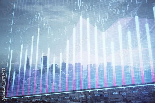 Forex graph on city view with skyscrapers background multi exposure. Financial analysis concept.
