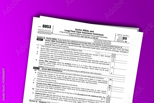 Form 8853 documentation published IRS USA 43873. American tax document on colored