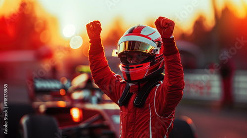 Formula 1 Driver Celebrates Victory with Raised Arms at Sunset Race Track